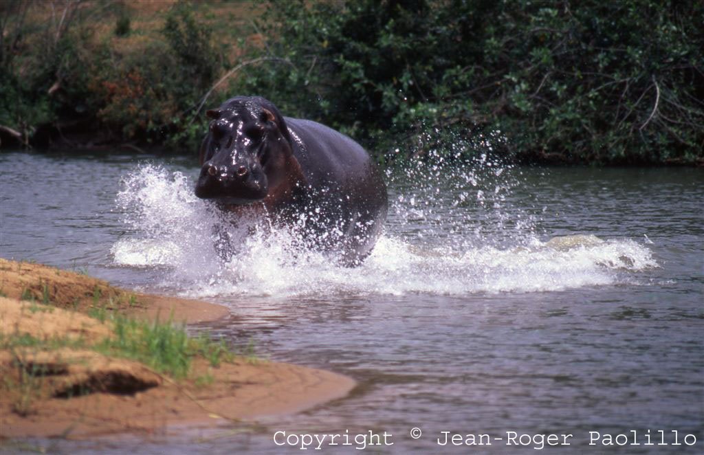 Blackface would actually leave the water when in full charge and many a time she put Jean-Roger or me up the nearest tree, which we climbed in a hurry to avoid coming to harm at the end of her formidable mouth. She would often get a kind of malevolent look in her eyes and then would charge without even a snort of warning.
