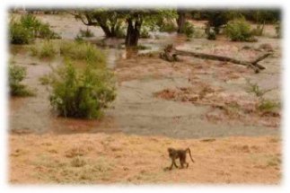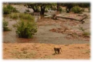 Here Scarface baboon walks in the old hay at Kuchek’s family feeding station, while the river is in full flood.