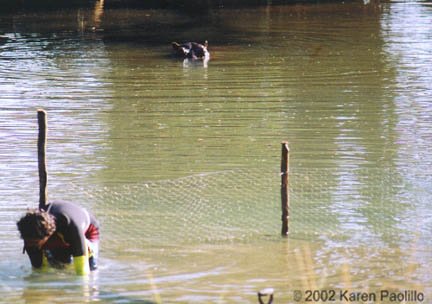 Starting operations with sand sparkling under ankle-deep, clear water is exhilarating. It works! Pretty soon you are holding the suction head chest deep in a perfectly shaped sand funnel. By the end of the first day though, you feel quite alone in the green murky pool you have dug.