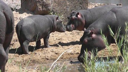 And then back to Karen and Jean-Roger’s house on the Turgwe River. Now our holiday seemed to be suddenly running out of time and I hadn’t seen nearly enough of the hippos. But I was to be spoilt some more. At the time of year we were there it was very unusual for see hippos on land because of the heat, but on the morning before we had to leave for Harare, there they were, five of them, on the sand by the river. Following Karen as quietly as I could we climbed onto a small rock to watch them. As we watched, Tasha also came out to of the water to join the others, the two bulls Robin and Kuchek being the only two left in the water. Little BonBon at last threw off her shyness and wandered about for me and then cuddled up to her mother. Cheeky the matriarch at one stage stood up warily at the sound of some baboons and we thought they would all rush back to the water, but she decided that all was okay and just settled back down. After about an hour or so Cheeky finally decided she was too hot and ambled back to the water slowly followed by the others except for Surprise who slept on. Karen talked to the hippos as we moved down from our boulder on to the sand only about 30 yards away from Surprise. Another special moment, to be that close to a wild, but very relaxed hippo. I was very honoured. The rest of the pod looked on from the water in between bobbing under, gapeing and chattering. In the meantime Maxi, Surprise’s calf, hung back near her but still in the water. Finally Surprise decided to join the others and little Maxi rushed to her with joy and they rubbed noses.