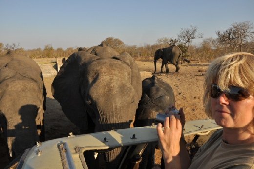 They all crowded around us and almost took my camera away. Had they wanted to they could have flipped the jeep over with just a nudge, but they were calm and relaxed, even the great bulls who were not known to Sharon were placid as they towered over us. Libby was feeling mischievous and at one stage put a dent in the jeep’s bonnet with her trunk, but at no time did we feel threatened.