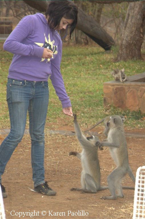 Back at the house we were visited by a family of about 30 vervet monkeys who lived nearby and regularly dropped in to take advantage of the food. We chopped up some oranges from the orange plantation at Humani Ranch, our nearest neighbours, and then headed out into their midst. The first monkeys to surround us were Dragonlady, the dominant female, Greedy, an aptly named male, and OO8, a baby with a broken tail. Some of the monkeys approached us and politely took the oranges from us, whereas others snatched them, and some weren’t brave enough so we had to throw them the oranges. We did our best to make sure everyone got some.