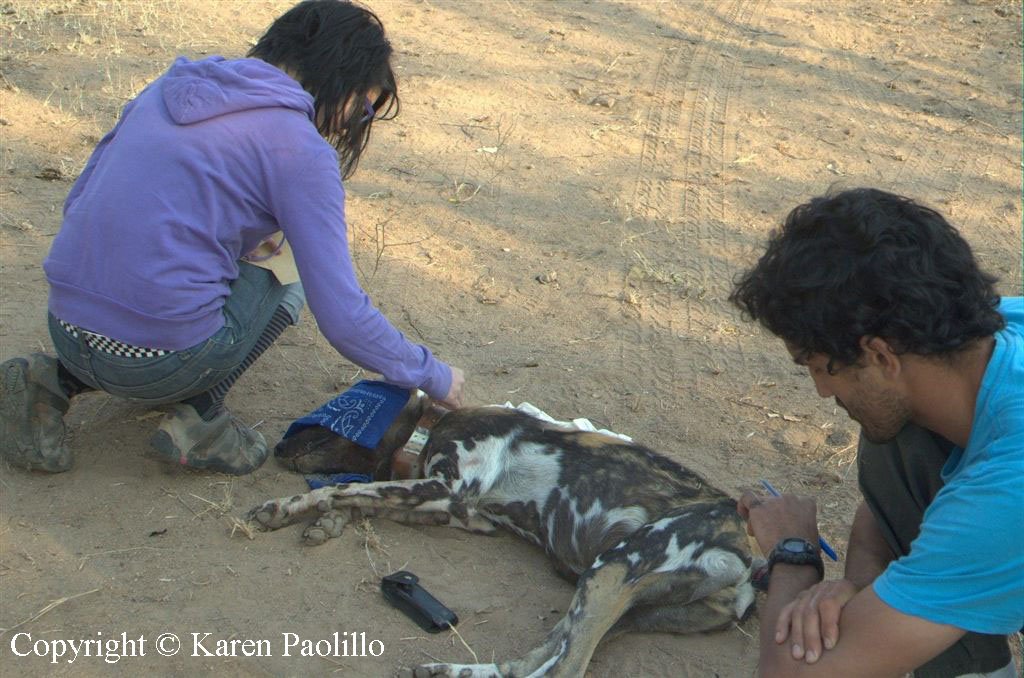 A couple of days later we darted another dog, and luckily this one went to sleep on the spot. After collecting the same data, Rosemary fitted a radio collar so that she could track the dog, along with the rest of the pack. Again, the dog woke up without any problems, and the puppies chased after the car as we drove away.