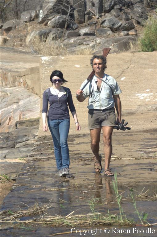 We were lucky enough to be able to spend some time with Dr. Rosemary Groom, a wild dog researcher working with packs in the conservancy. For a few mornings we got up before first light to go with her and Rafael Crespo, her volunteer, to one of the dens and see the dogs. There were two litters of puppies, and the older pups were very curious, coming right up to the car, playing, and just having fun the way all puppies do. One of the dogs, a female yearling, had been snared, and we were able to dart her in order to remove the snare. Unfortunately, after being darted the pack split and we lost her into the bush. We split up and combed the bush in search of her, and after about 45 minutes Karen found her, which wasn’t easy since the dog was designed to be camouflaged.
