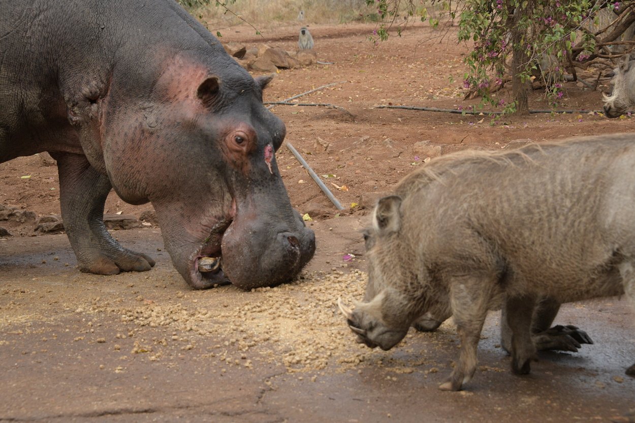 Max is relatively calm in that I can sit on the outside step and talk to him and if he gets a scare when someone bangs something or the rangers come in from a patrol, he will move off. I call him and he then returns to the food. I am offering him as I did Steve: horse cubes as this encourages him to stay around the home where I hope we can keep a watchful eye over him. His dad Kuchek will, like any bull, try to attack Max. This is the normal behavior of hippo males towards their young sons. It is to teach them to move away from the family because at a much later stage they will be competition to their father.