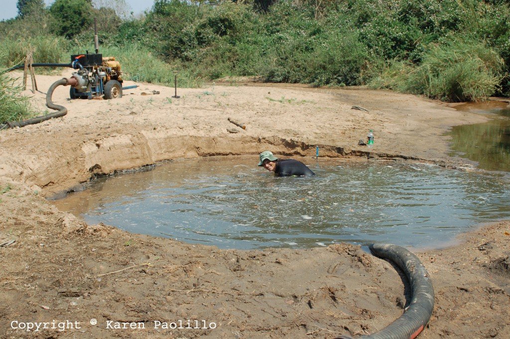 To help the hippos she had to be structured, find ways to improve their lives. Often this entailed undertaking mundane work, such as digging in rivers to improve blocked up channels. To getting out there in the bush amongst the other wild inhabitants and finding the weak links that were causing hippos to decline in numbers and to make a plan. In Zimbabwe making a plan is part of the local language, and believe me it works if the passion and the purpose are there. Her husband a Geologist assists Karen whenever possible. He designed a pump that could be used to remove excess sand from the river and create pools for the hippos to live in.